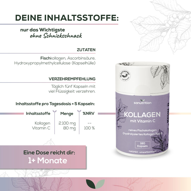Fischkollagen, Ascorbinsäure, Hydroxypropylmethylcellulose (Kapselhülle)