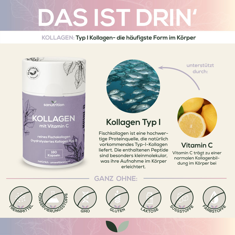 Unsere Kollagen Kapseln mit Vitamin C vereinen hochwertiges Kollagen Typ 1 aus nachhaltigem Fisch mit dem Power-Antioxidans Vitamin C. Vitamin C ist der Schlüssel zur Kollagenbildung im Körper. Es trägt zu einer normalen Kollagenbildung bei. Gleichzeitig schützt es deine Zellen vor oxidativem Stress und unterstützt das Immunsystem – für einen rundum gesunden Körper.