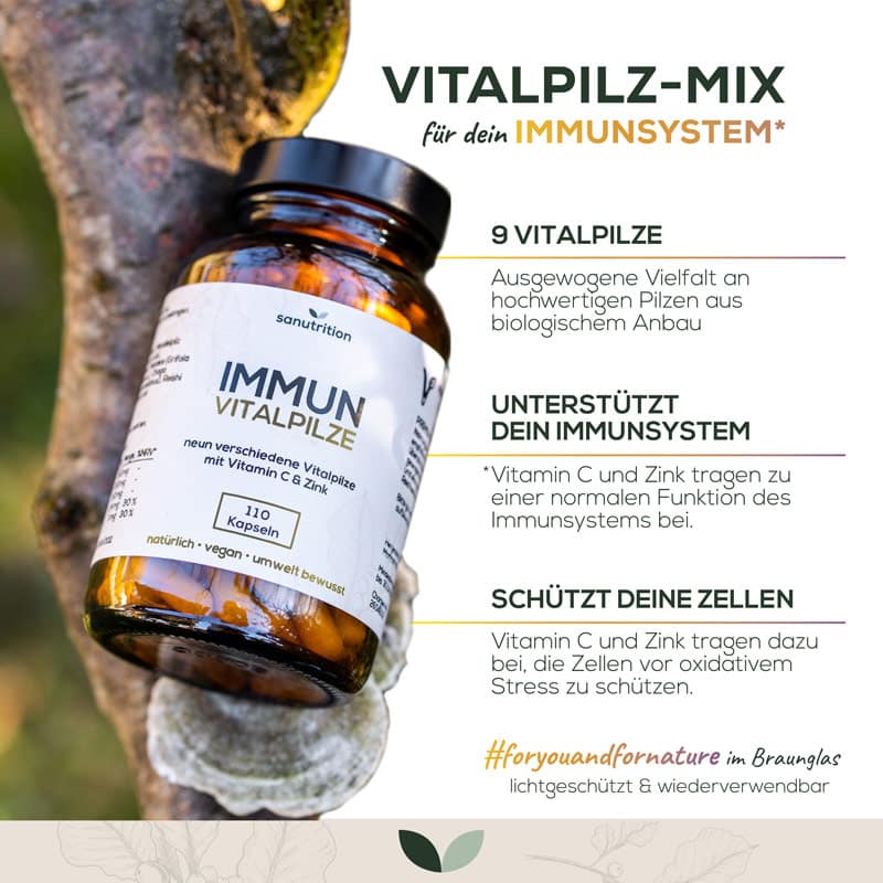 In unserem Vitalpilz-Mix haben wir eine sanfte und abgerundete Mischung aus neun Pilzen zusammengestellt. Unterstützt werden sie von den zwei klassischen Wirkstoffen: Vitamin C und Zink. Diese unterstützen nachgewiesen die Funktion deines Immunsystems und schützen deine Zellen vor oxidativem Stress (Antioxidantien). Die Kapseln sind besonders für dich geeignet, wenn du eine sanfte und langfristige Unterstützung deines Immunsystems und Wohlbefindens suchst.