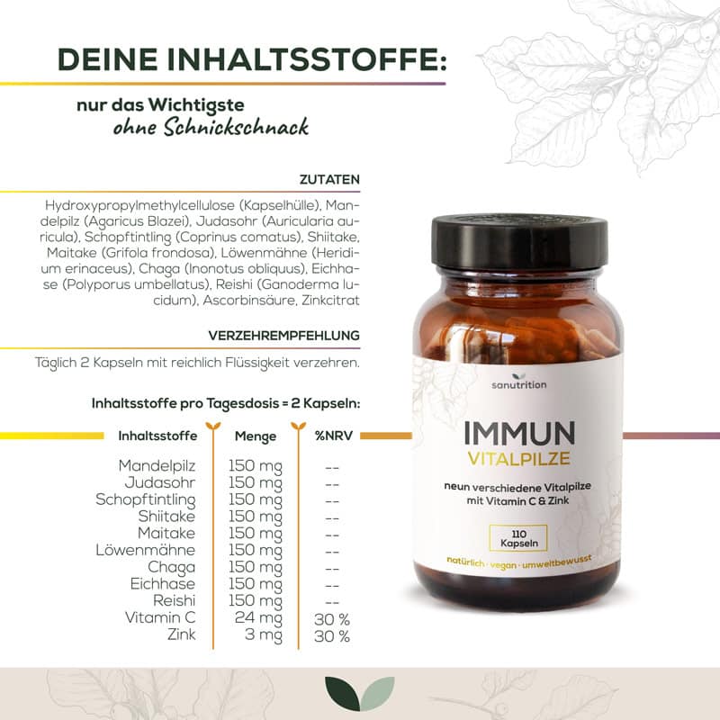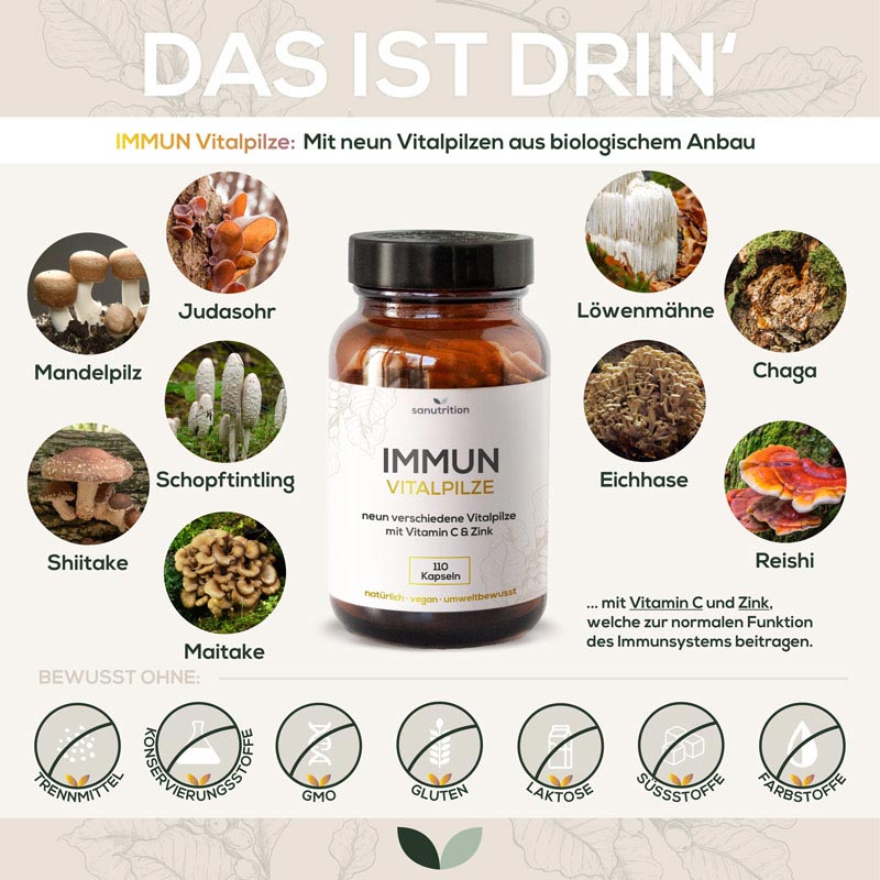 Hydroxypropylmethylcellulose (Kapselhülle), Mandelpilz (Agaricus Blazei), Judasohr (Auricularia auricula), Schopftintling (Coprinus comatus), Shiitake, Maitake (Grifola frondosa), Löwenmahne (Heridium erinaceus), Chaga (Inonotus obliquus), Eichhase (Polyporus umbellatus), Reishi (Ganoderma lucidum), Ascorbinsäure, Zinkcitrat
