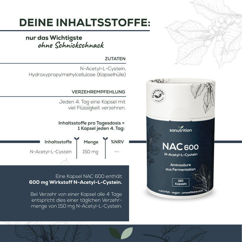 Eine Kapsel enthält 600 mg N-Acetyl-L-Cystein. Bei Verzehr von 1 Kapsel alle 4 Tage entspricht dies einer täglichen Verzehrmenge von 150 mg N-Acetyl-L-Cystein. Nicht für Personen unter 18 Jahren empfohlen.