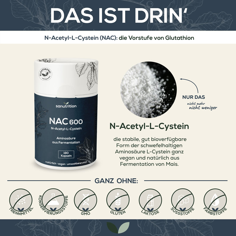 Unser NAC 600 enthält 600 mg N-Acetyl-L-Cystein pro Kapsel – eine stabile, gut bioverfügbare Form der schwefelhaltigen Aminosäure L-Cystein. Das Produkt wird aus pflanzlicher Fermentation gewonnen, ist vegan und frei von tierischen Bestandteilen. N-Acetyl-L-Cystein (NAC) ist eine Vorstufe des körpereigenen Glutathions. Glutathion ist eine schwefelhaltige Verbindung, die in allen Körperzellen vorkommt und eine Rolle im Zellstoffwechsel spielt. Mit zunehmendem Alter, bei unausgewogener Ernährung oder hoher Belastung kann die körpereigene Produktion von Glutathion abnehmen. NAC dient als Baustein für die körpereigene Synthese von Glutathion.
