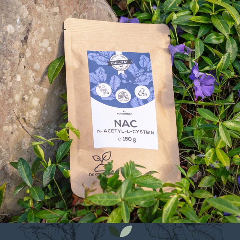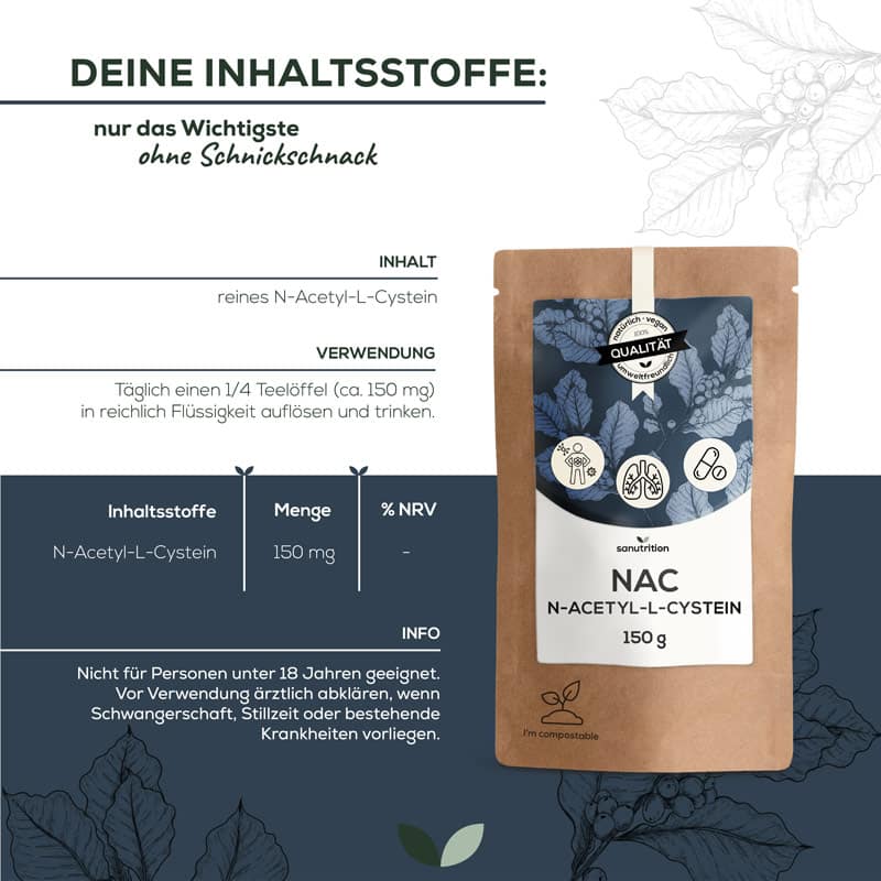 Unser NAC Pulver enthält 150 g reines N-Acetyl-L-Cystein, die stabile, gut bioverfügbare Form der schwefelhaltigen Aminosäure L-Cystein. Das Produkt wird aus pflanzlicher Fermentation gewonnen, ist vegan und frei von tierischen Bestandteilen. N-Acetyl-L-Cystein (NAC) ist eine Vorstufe des körpereigenen Glutathions. Glutathion ist eine schwefelhaltige Verbindung, die in allen Körperzellen vorkommt und eine Rolle im Zellstoffwechsel spielt. Mit zunehmendem Alter, bei unausgewogener Ernährung oder hoher Belastung kann die körpereigene Produktion von Glutathion abnehmen. NAC dient als Baustein für die körpereigene Synthese von Glutathion.
