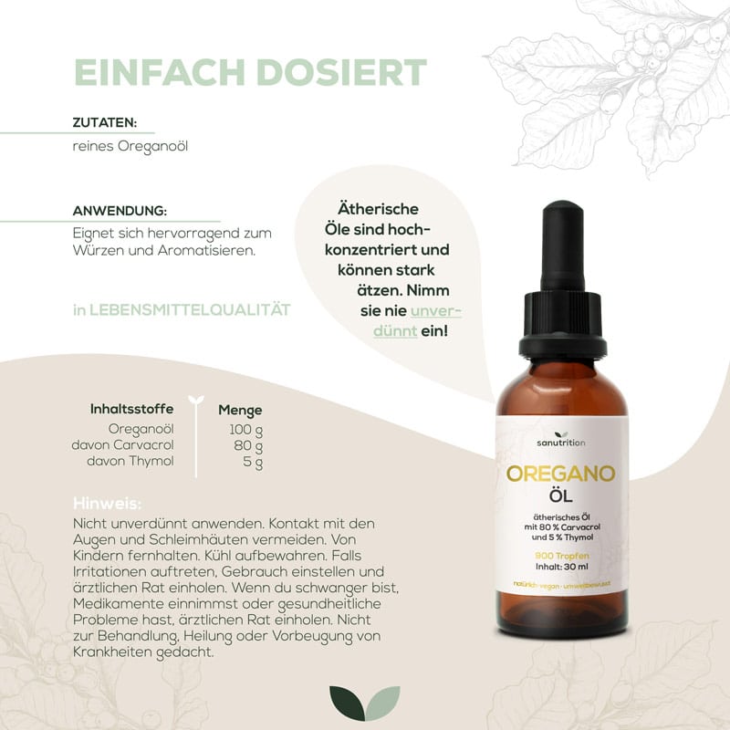 Oreganoöl Tropfen enthalten das ätherische Öl aus Oregano. Oregano (Origanum vulgare) ist eine Pflanze, die für ihre kulinarischen und medizinischen Eigenschaften bekannt ist. Bei uns findet sie öfters Verwendung zum Aromatisieren von italienischen Gerichten. Das ätherische Öl gewinnt man durch Dampfdestillation der Blätter und Blüten. Es enthält eine hohe Konzentration an sekundären Pflanzenstoffen, wie Carvacrol und Thymol. Diese natürlichen Verbindungen tragen zum charakteristischen Aroma und den besonderen Eigenschaften des Oreganoöls bei.