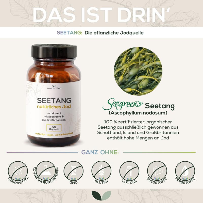 Seetang (Ascophyllum nodosum) ist eine natürliche Quelle für Jod, ein essentielles Spurenelement, das zur normalen Produktion von Schilddrüsenhormonen und zu einer normalen Schilddrüsenfunktion beiträgt. Jod unterstützt außerdem einen normalen Energiestoffwechsel, die normale Funktion des Nervensystems und trägt zur Erhaltung normaler Haut bei.