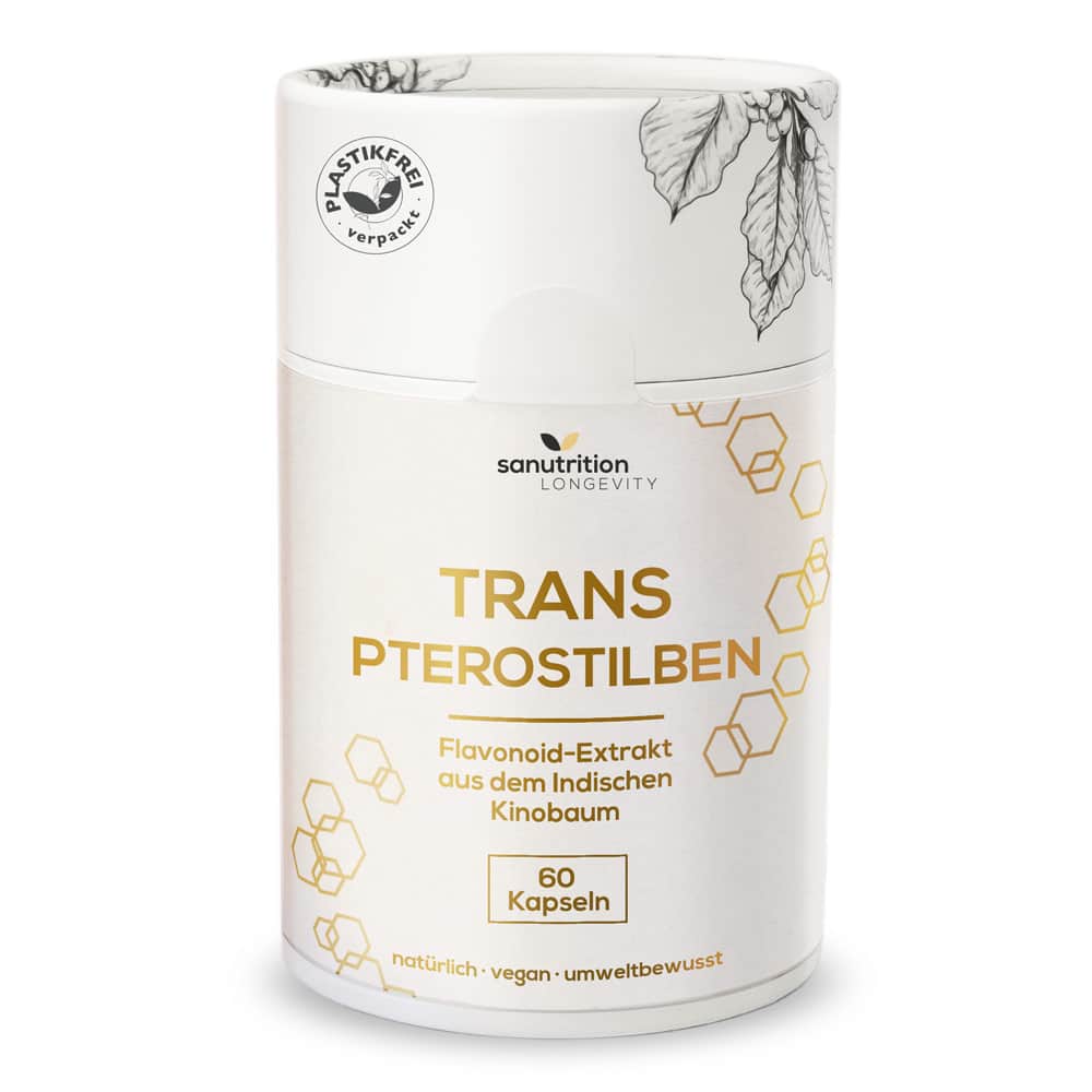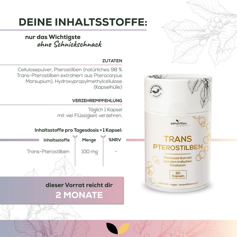 Pterostilben gehört zu der Gruppe der Stilbene. Diese sind wiederum Teil der Polyphenole, also natürliche Pflanzenstoffe. Pflanzen bilden Stilbene meist zur Abwehr gegen Stress, wie UV-Strahlung oder Pilze. Du findest sie in Blaubeeren oder auch im Kinobaum. Aus dessen Kernholz erhalten wir unser rein pflanzliches Trans-Pterostilben. Die Trans-Form bietet dir die aktive und stabile Version des Stoffes, wobei wir darauf geachtet haben ein Extrakt zu finden, das eine hohe Standardisierung von mindestens 98% aufweist.